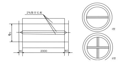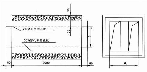 • □該消聲器是微穿孔板消聲器的改進型。它具有膨脹空腔和阻性吸聲功能,通過風速在6-8m/s為合適,最高應小于12m/s,具阻性吸聲部分有良好的熱絕緣性能,故消聲器外表不做保溫層,有利于節省造價及方便安裝。