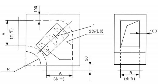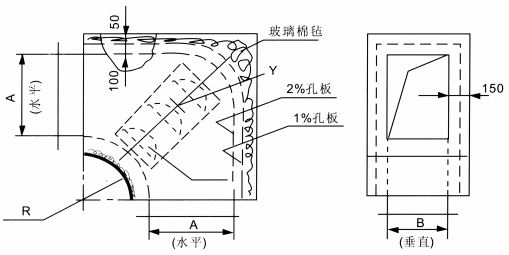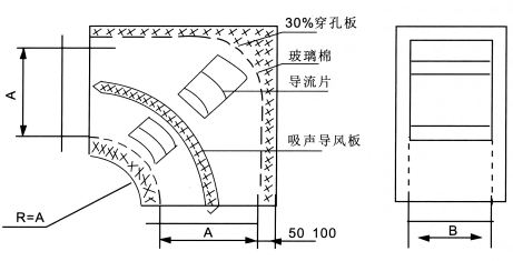 • ZWB型消聲彎管是使風管短邊B拐彎90度,并具有一定消聲作用的彎管,其拐彎半徑為風管內壁長邊A,吸聲材料厚為50和100mm。