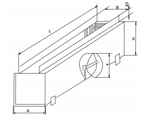 • B尺寸為接條縫風口喉徑寬度A≥B+100,L為風口長度 H≥Φ+100。